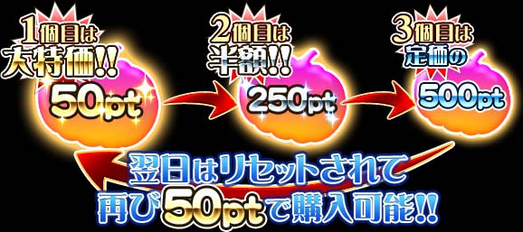 通常価格500ptのところ、毎日初回は50pt、2個目は250ptで購入できる特別セールです!!
