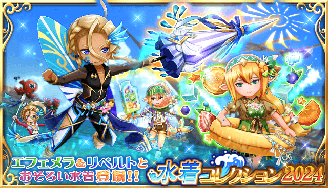 夏真っ盛り!! 過去人気だった水着入りガチャがダブルで復刻!! エフェメラ&リベルトとおそろい水着の[水着コレクション2024] 魔王カイン&シャレーネとおそろい水着の[水着コレクション2022] お気に入りの水着で夏を楽しもう♪