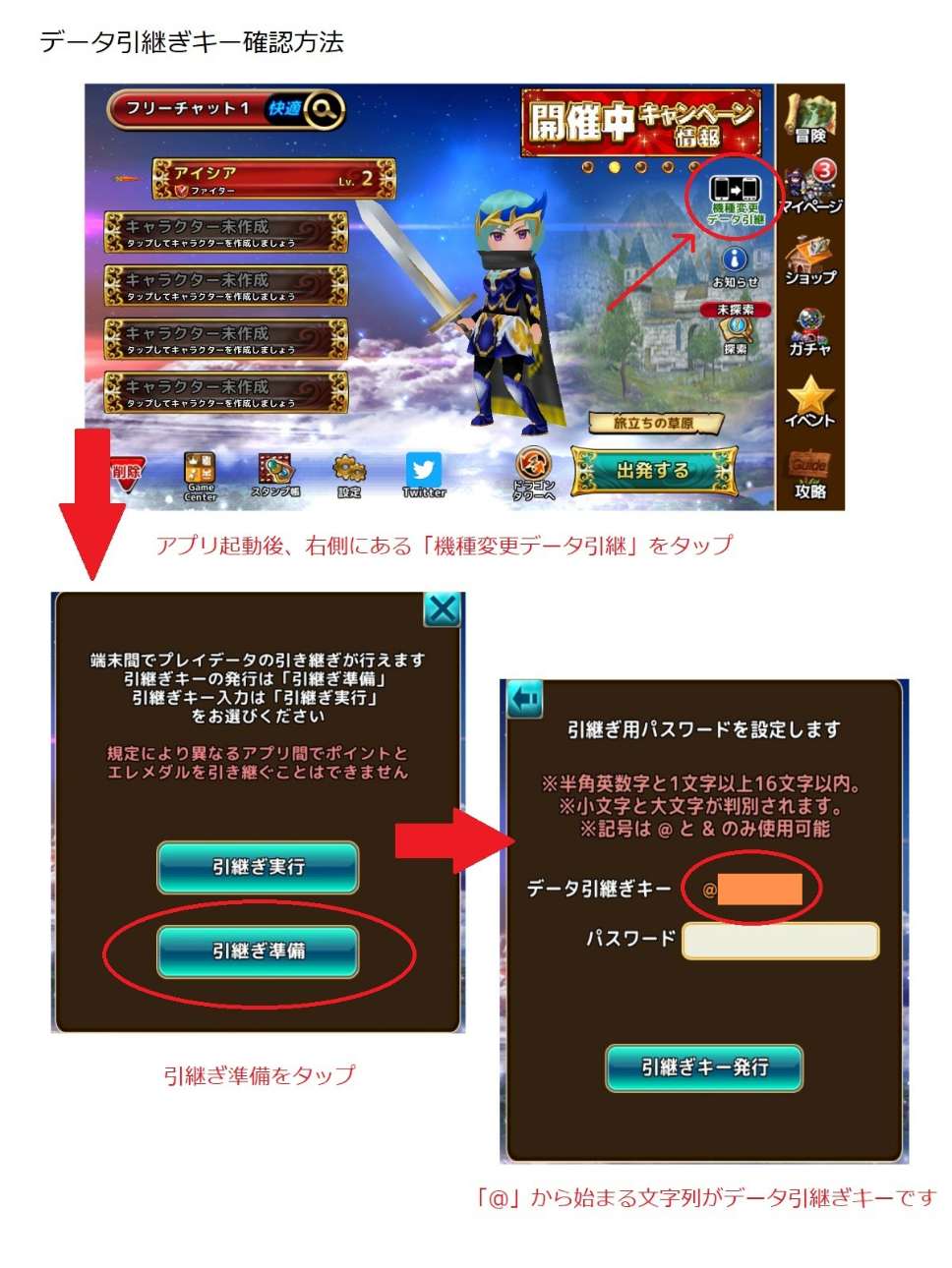 ゲームを起動>キャラクター選択画面>「アカウント」>「データ引継ぎ」>「引継ぎ準備」