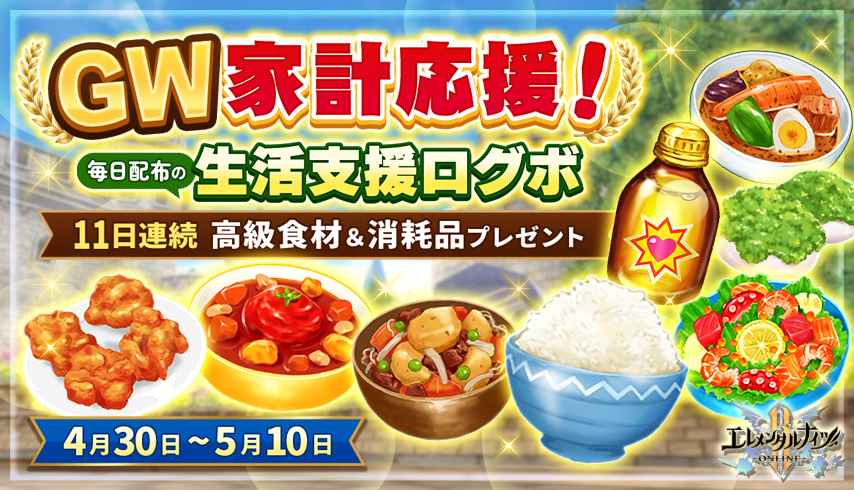 期間中ログインするだけで、冒険者の食卓を彩る「料理アイテム」を毎日プレゼントします。