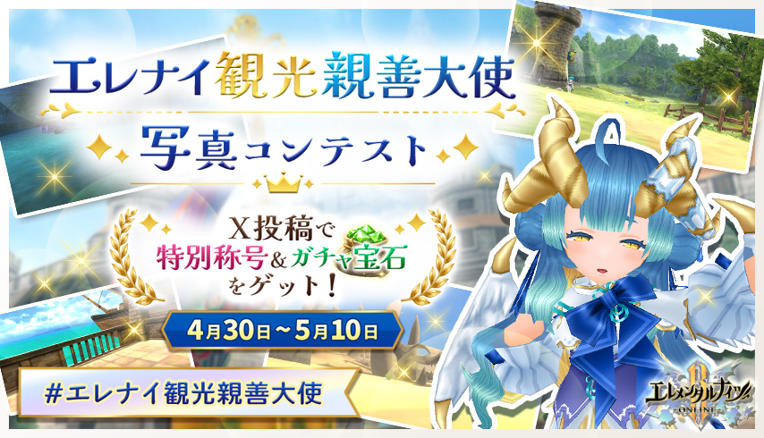 ゲーム内で 「旅行を楽しんでいる写真」 を撮影して、ハッシュタグ「#エレナイ観光親善大使」 をつけてXに投稿!